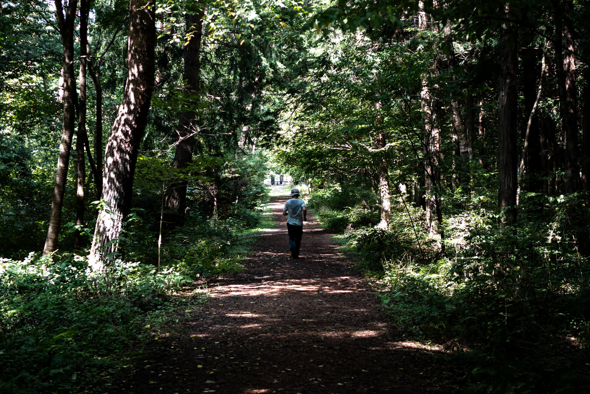 信州大芝高原の一角にある「みんなの森」には、セラピーロードという森林に囲まれた散歩道があります。散歩する人はもちろん、陸上部らしき子たちの練習コースにもなっていたり、主に地元の方たちが思い思いに使用しています。そして、樹齢100年を超えるアカマツやヒノキの巨木もあり、この森の歴史を感じさせもします。