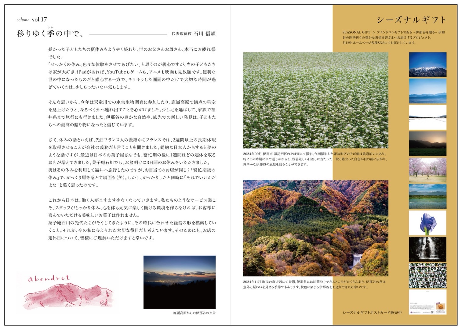 菓子庵石川では、色彩豊かな伊那谷を菓子屋としての表現でお届けしたい。