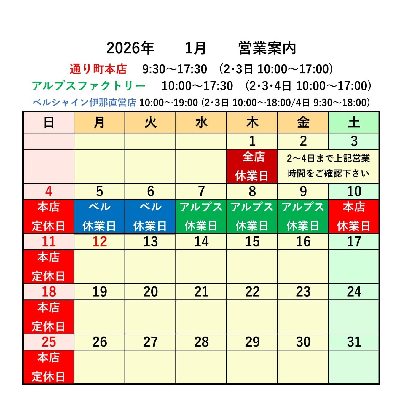 1/4(日)10(土)11(日)休業