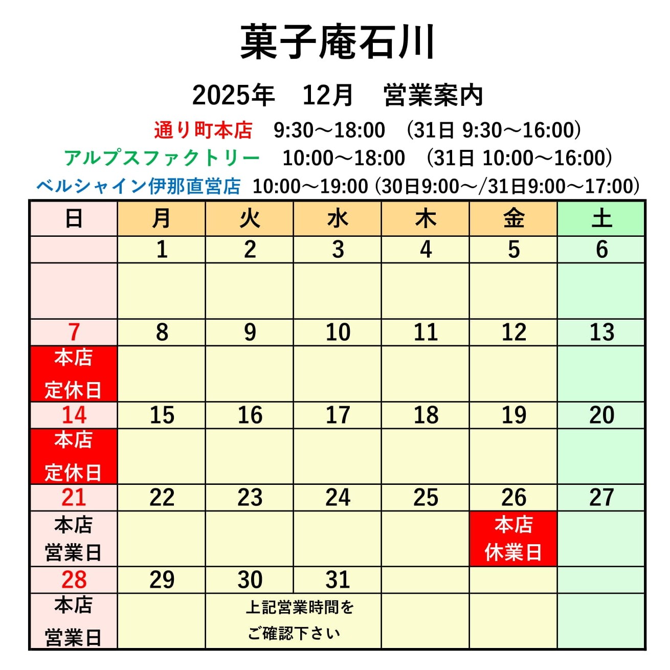 年末年始の各店の営業時間は以下の通りとなります。