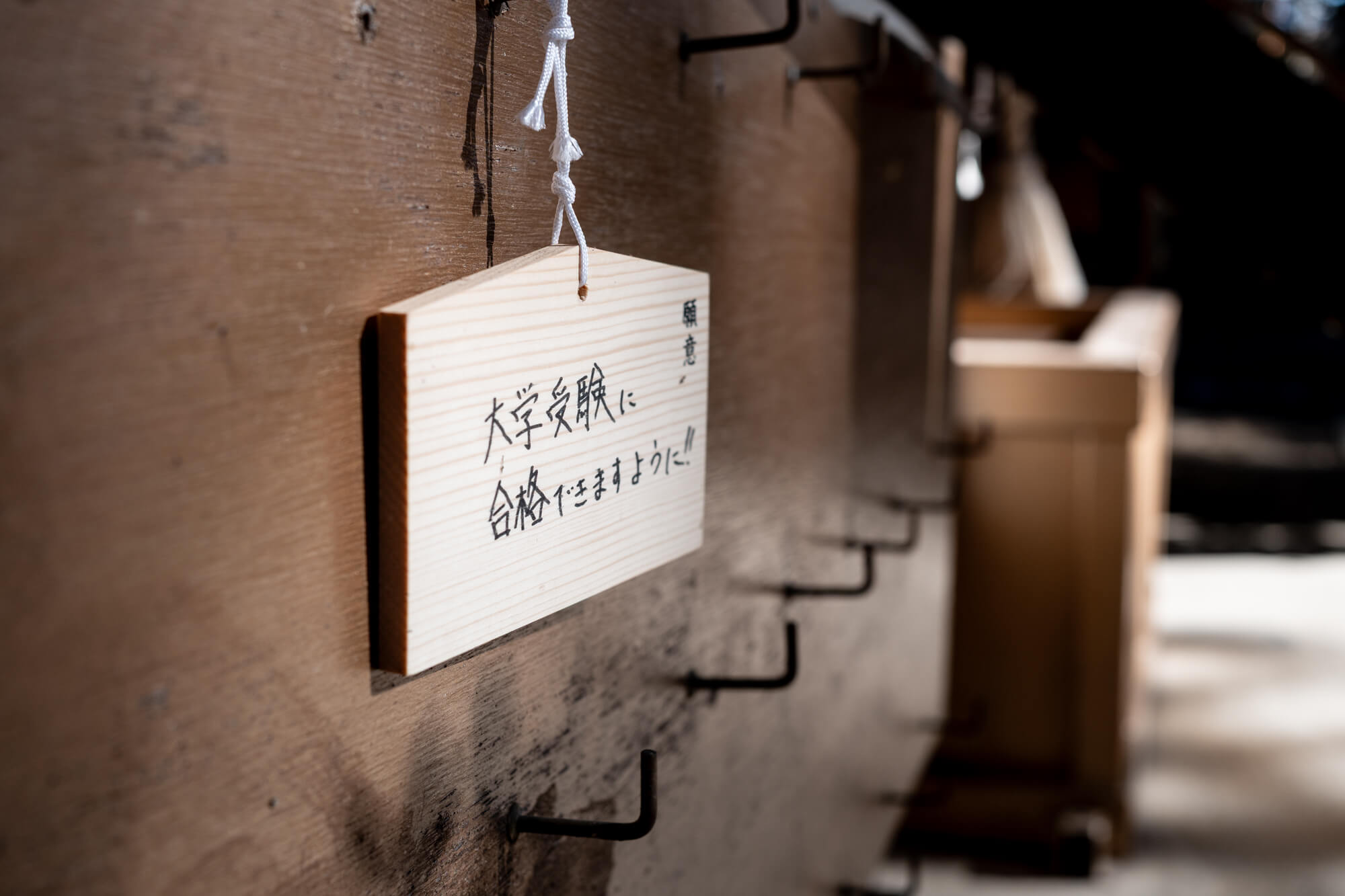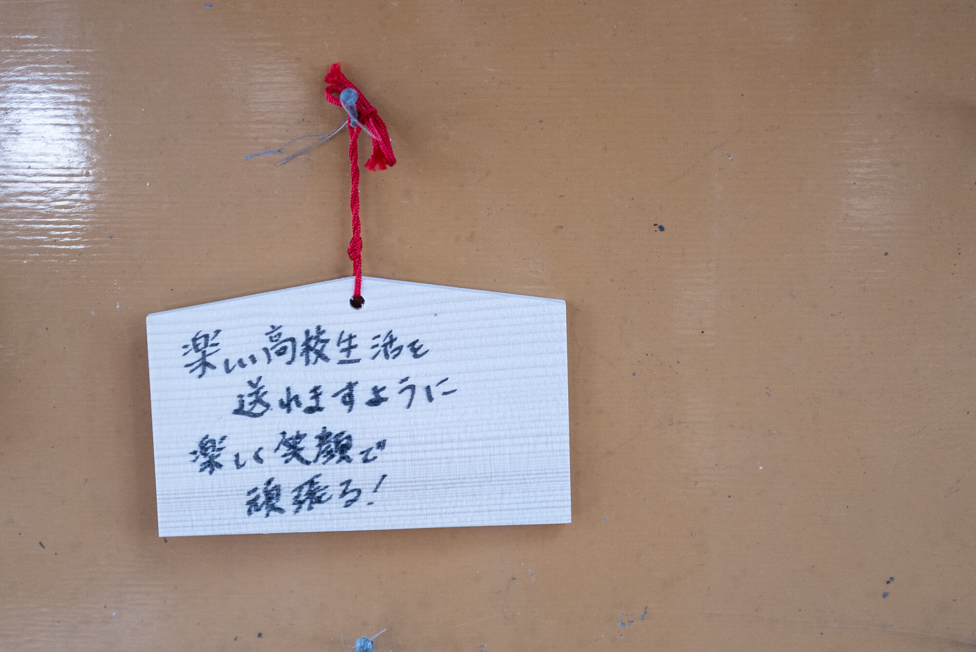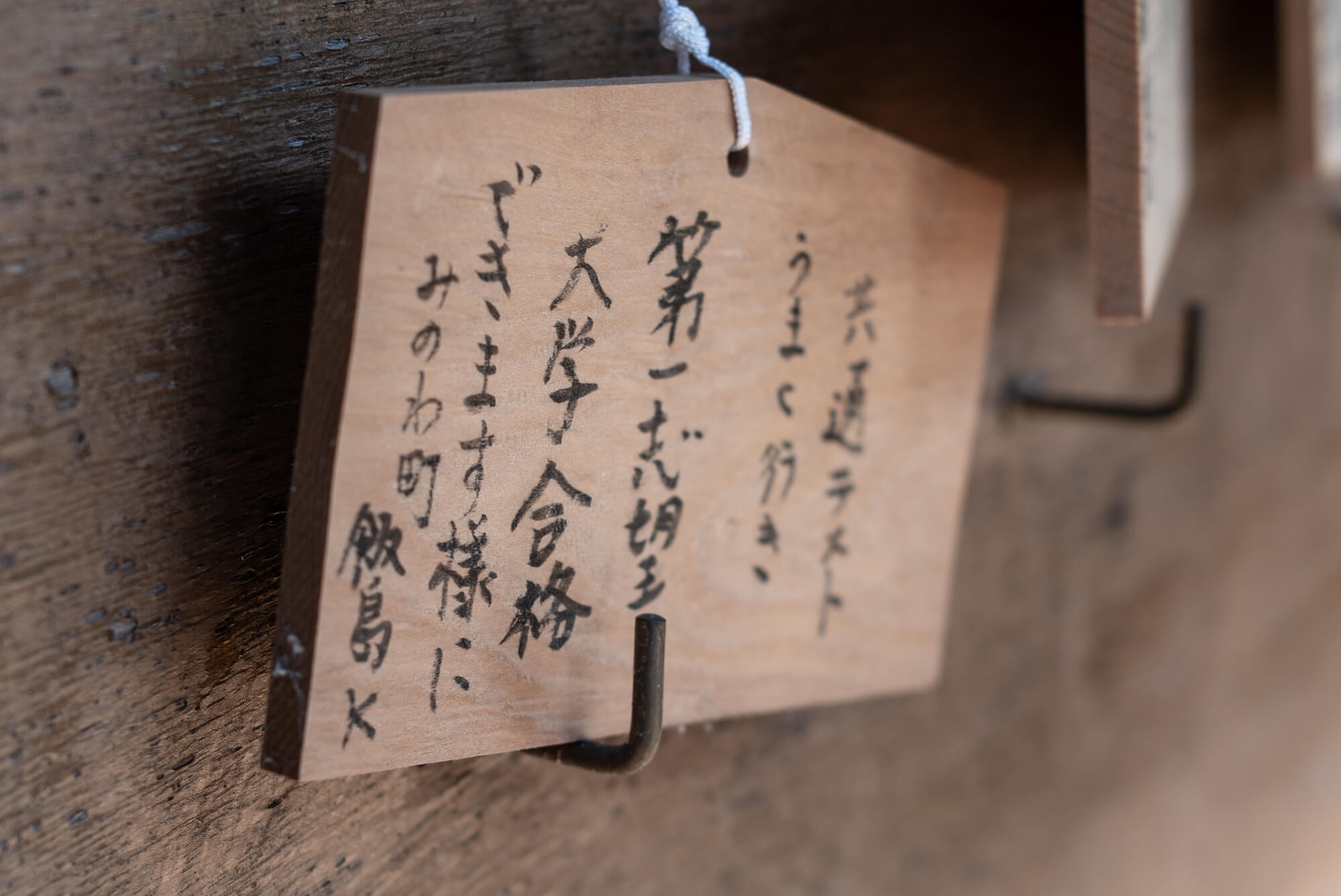 レンズを向けたのは、伊那中学校の美術部が毎年奉納しているという立派な絵馬です。その下には、願い事が書かれた小さな札がちらほら。よく見ると、すべて合格を願うメッセージ。一文字ずつ丁寧に書かれたその文字からは、これまでの努力と、わずかな不安が透けて見えるようです。