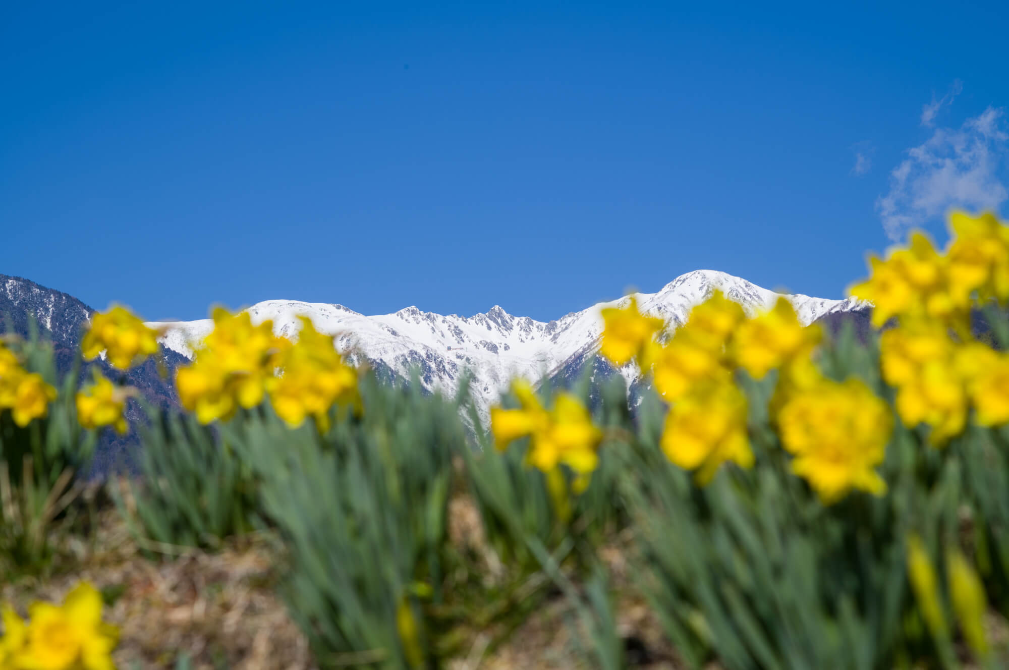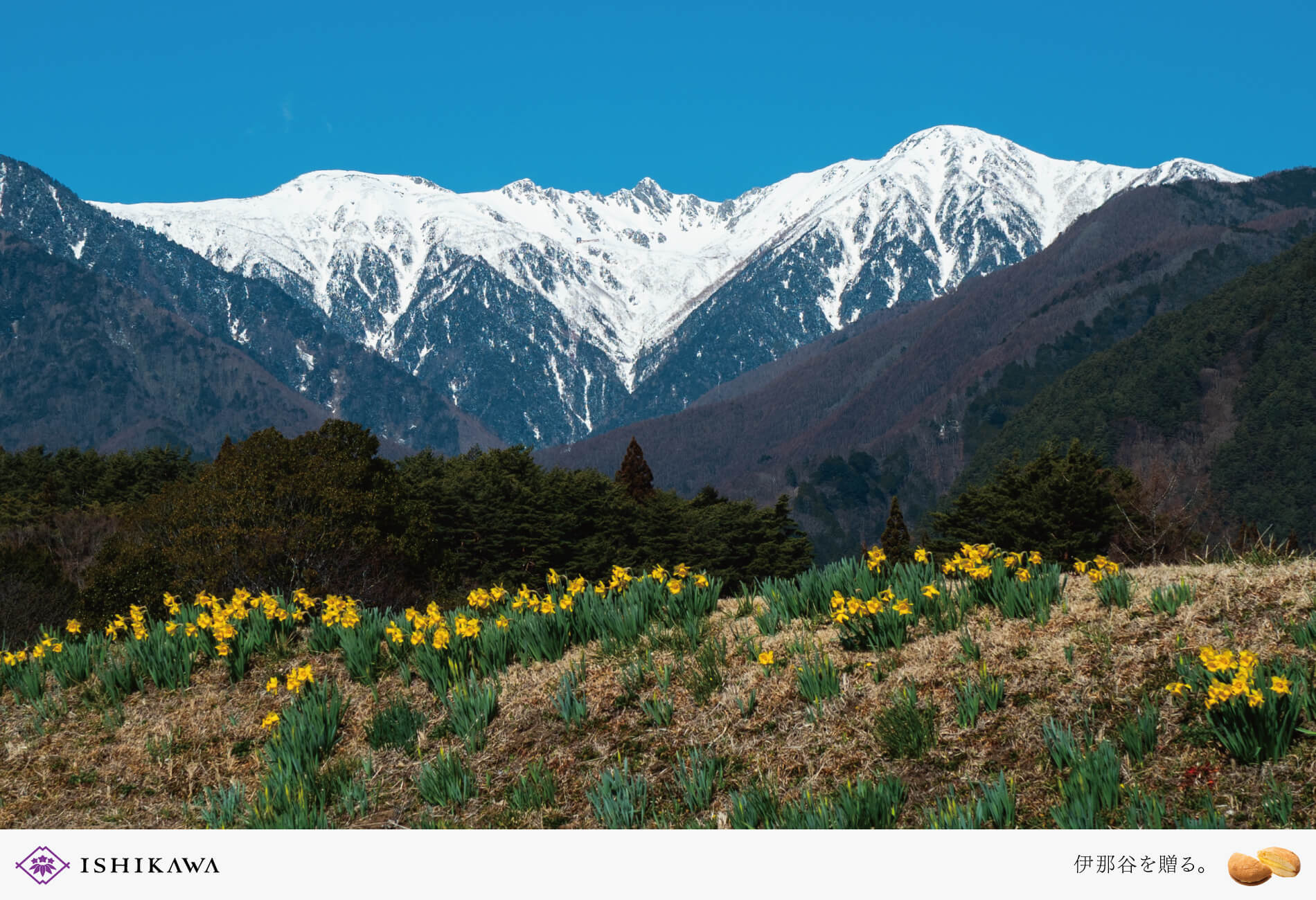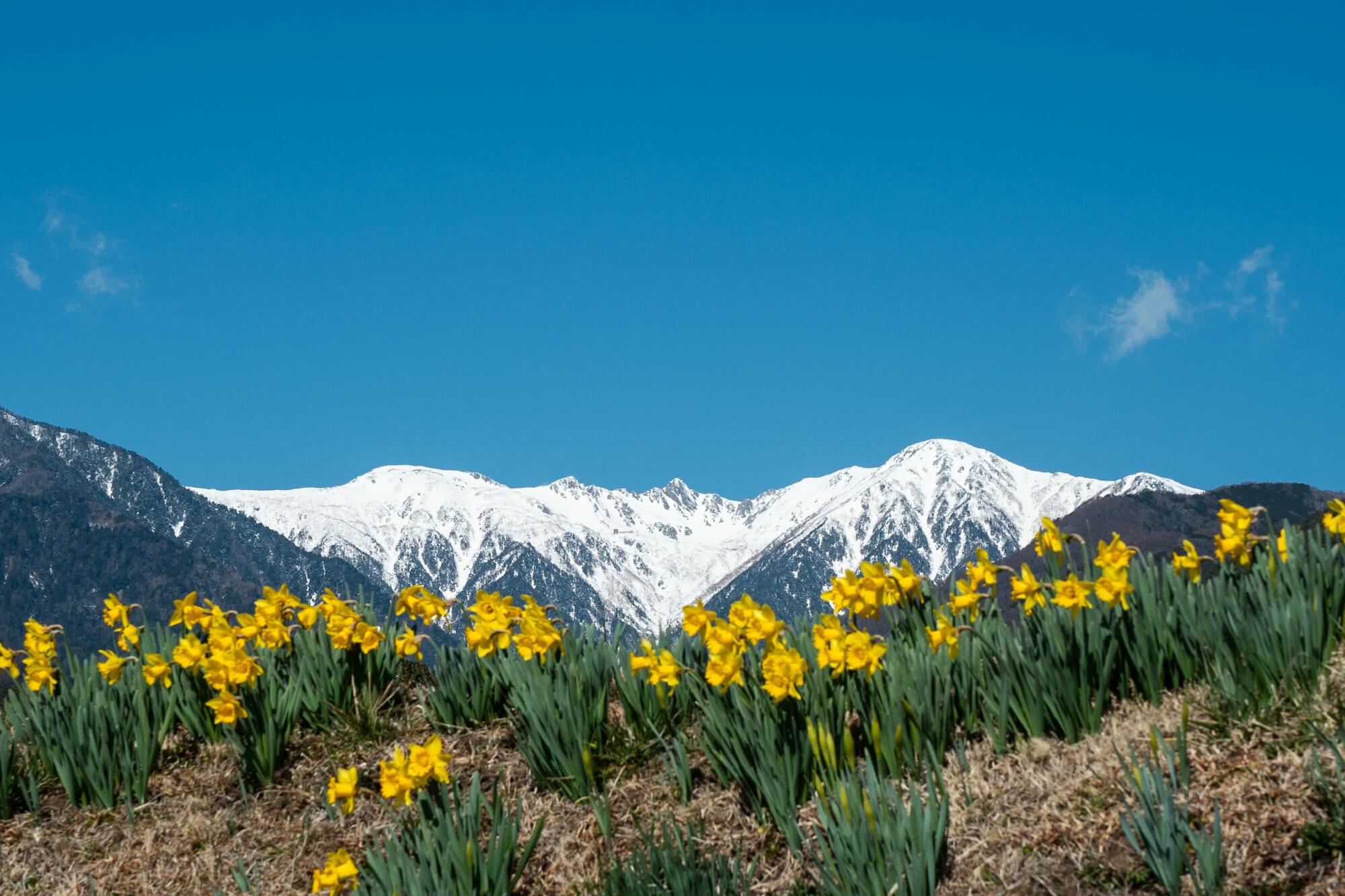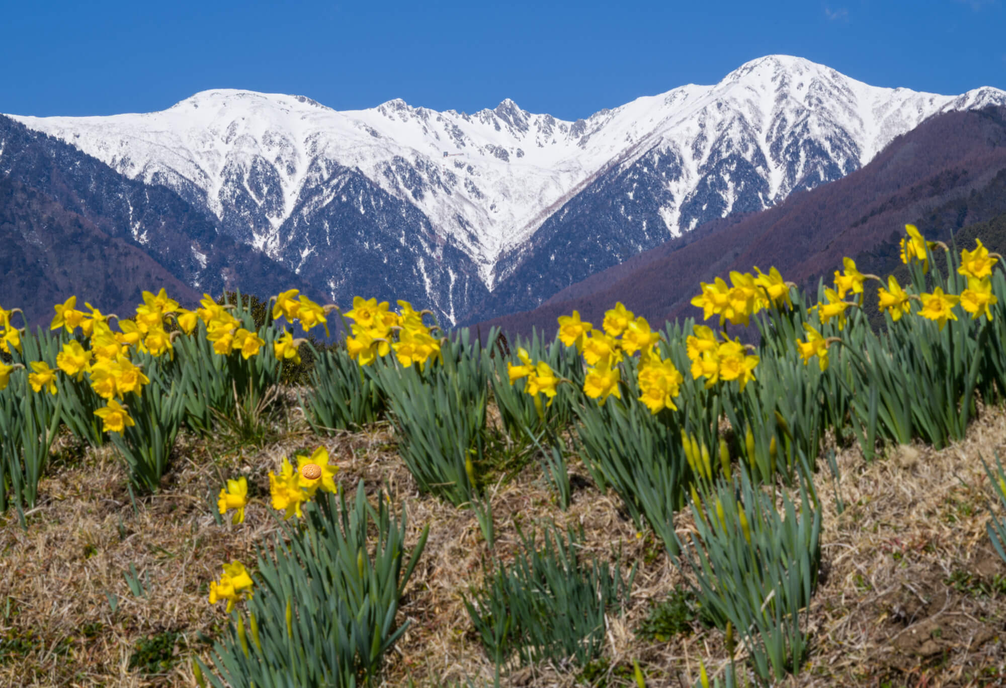 まだ深く雪を頂いた中央アルプスの雄大な姿と、手前の土手斜面に群生する水仙(スイセン)たち。