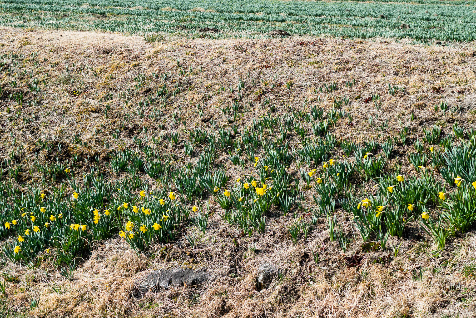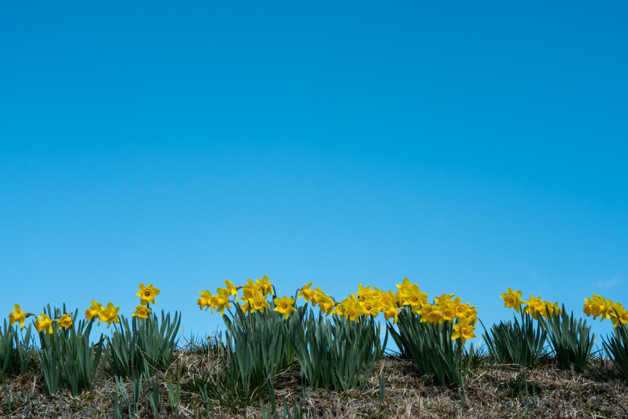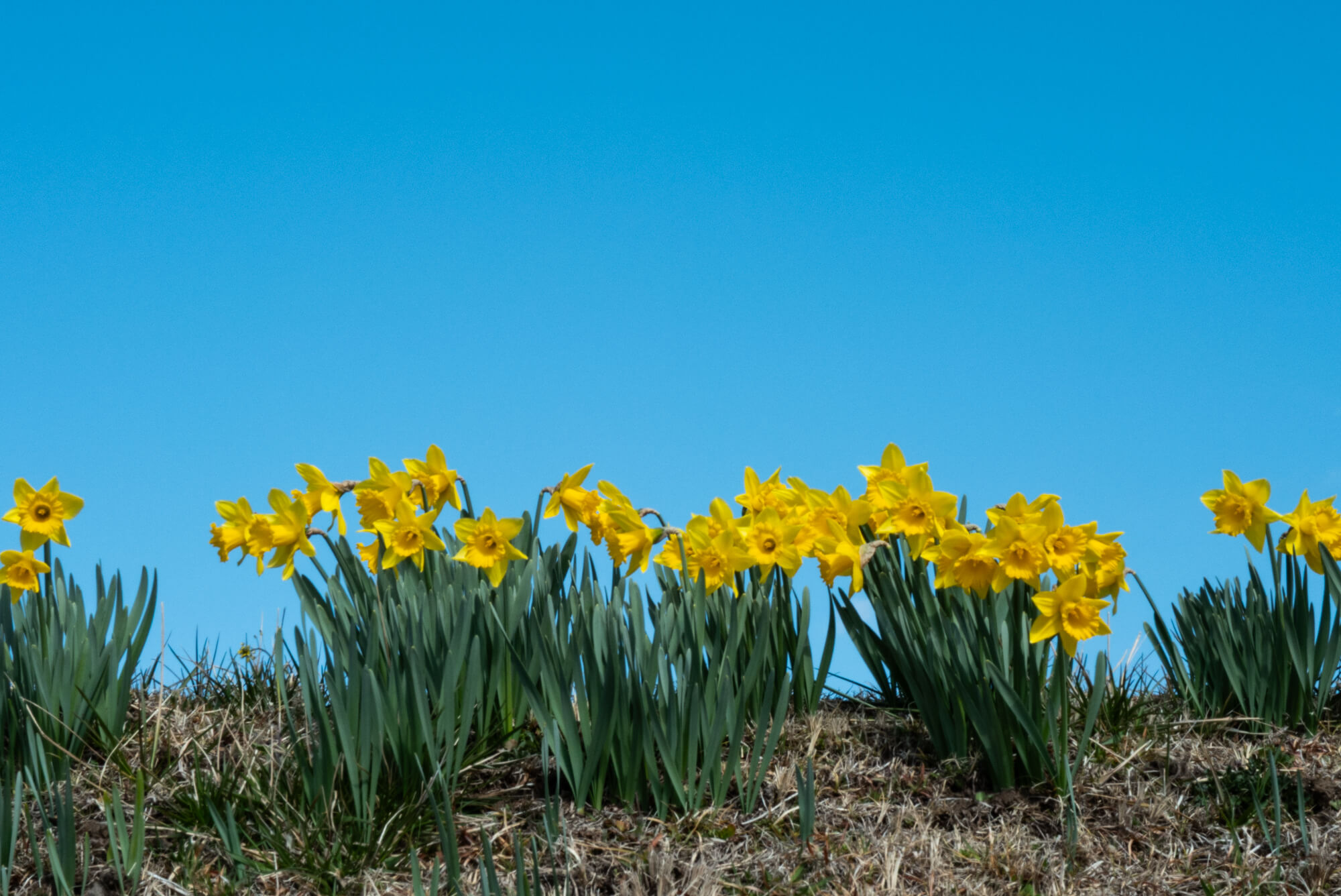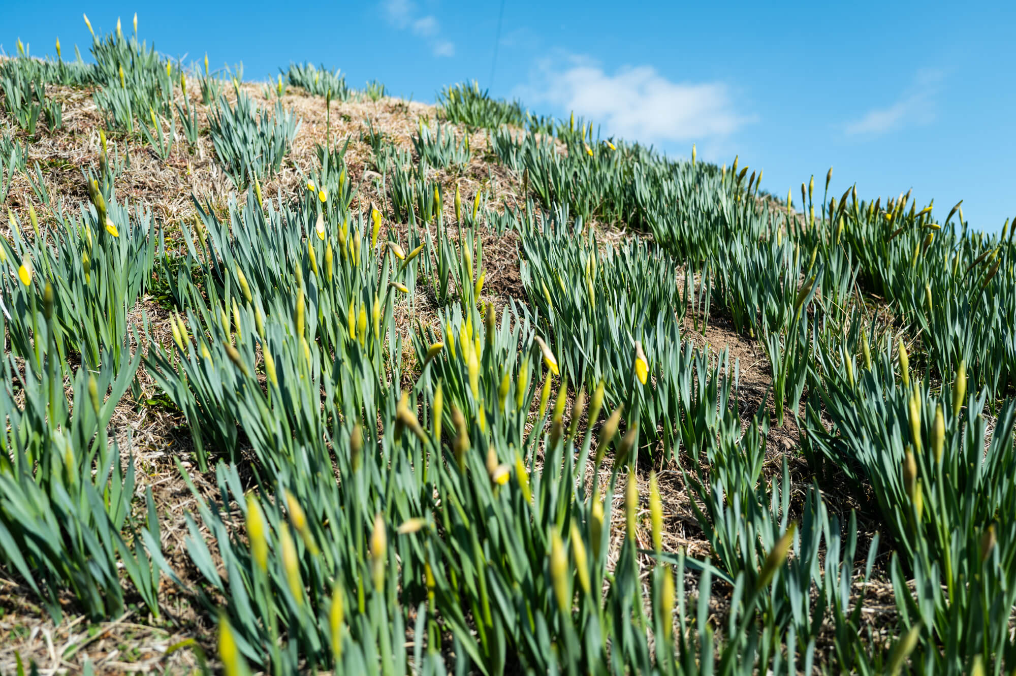 撮影時、水仙たちはまだまだ満開ではなく、けれど確かなエネルギーを秘めた蕾(つぼみ)を覗かせている「これから」の様子でした。厳しい冬の寒さを土の中でじっと耐え抜き、今まさに光に向かって花開こうとするその姿は、この地域に本格的な春が近づいていることを告げているかのようです。