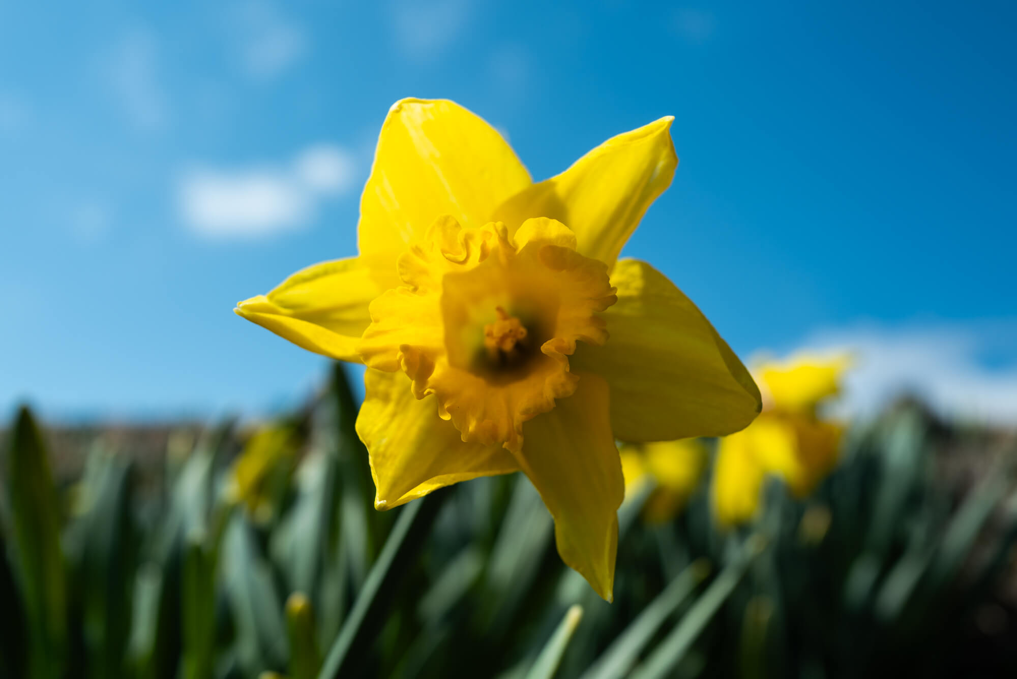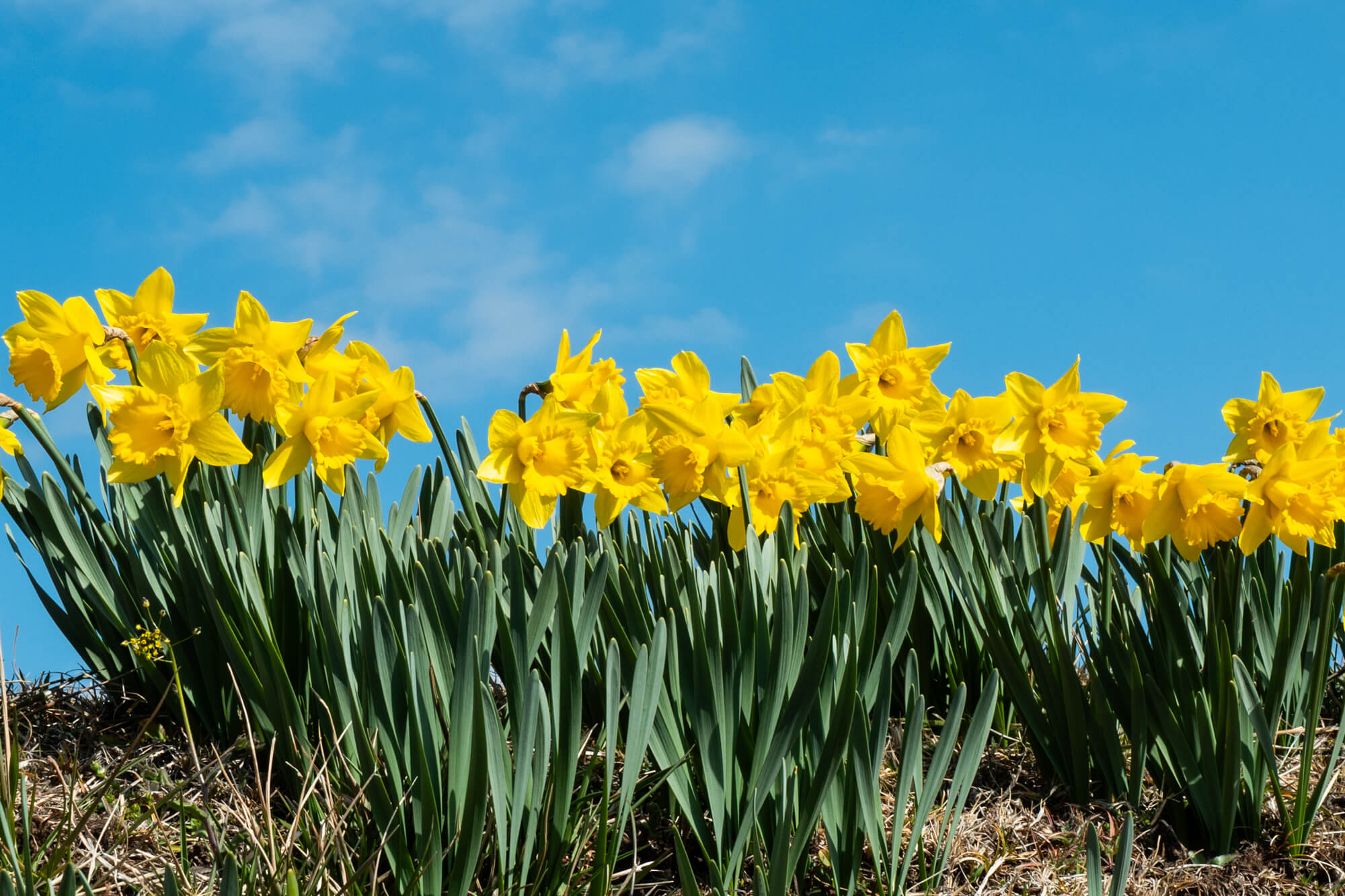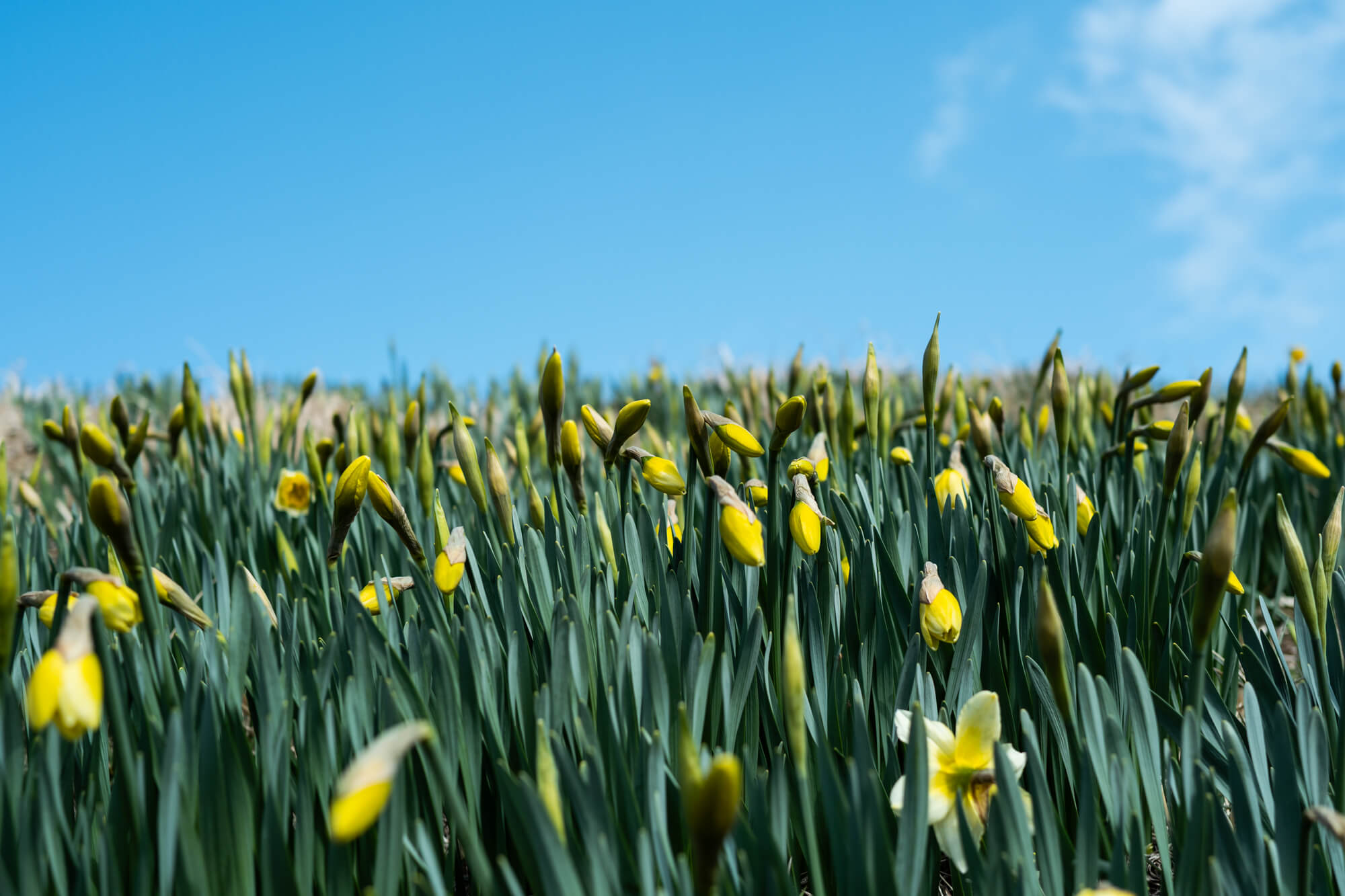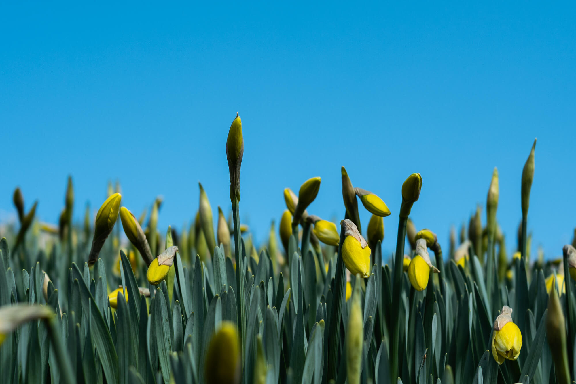 撮影時、水仙たちはまだまだ満開ではなく、けれど確かなエネルギーを秘めた蕾(つぼみ)を覗かせている「これから」の様子でした。厳しい冬の寒さを土の中でじっと耐え抜き、今まさに光に向かって花開こうとするその姿は、この地域に本格的な春が近づいていることを告げているかのようです。