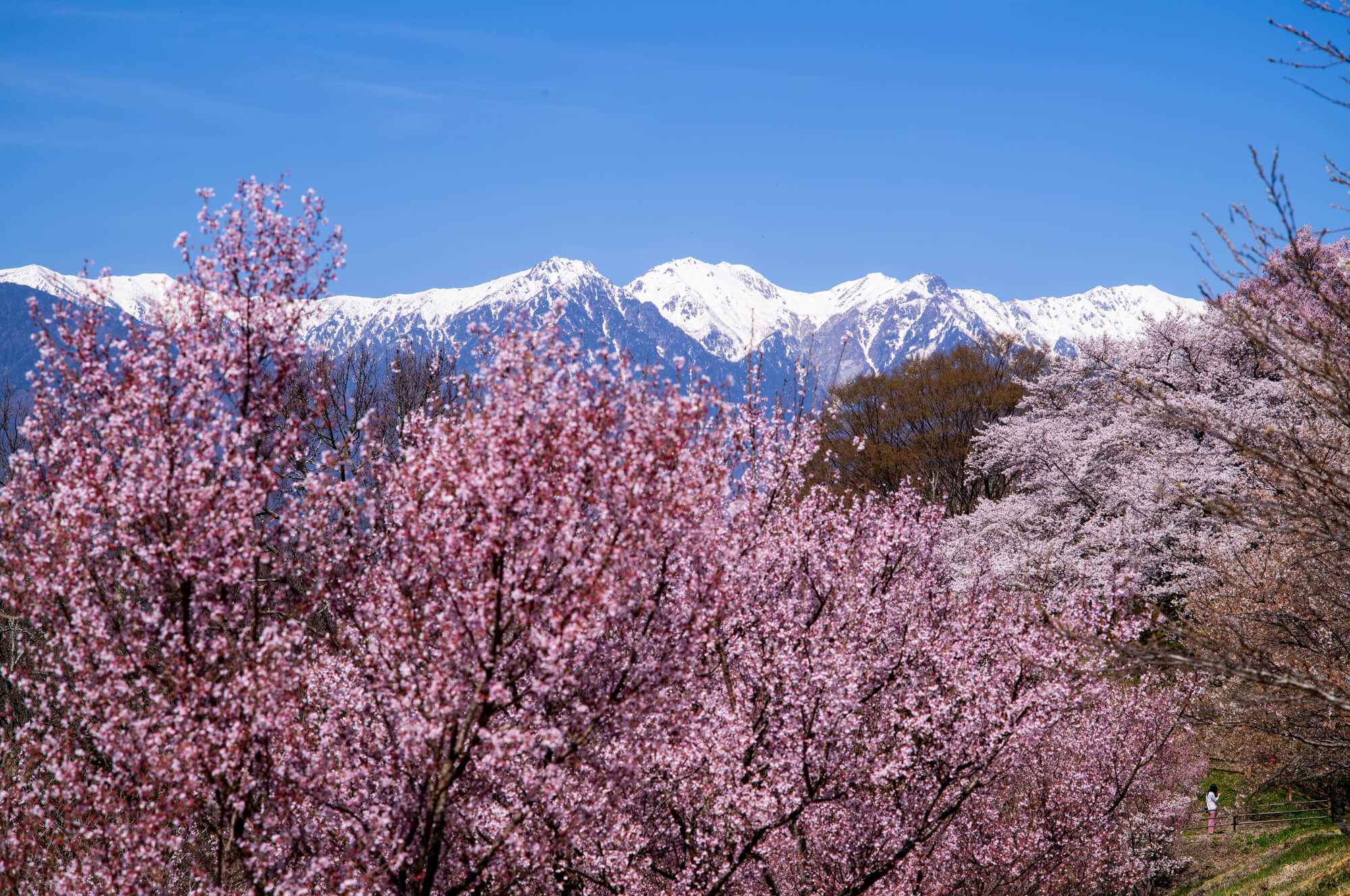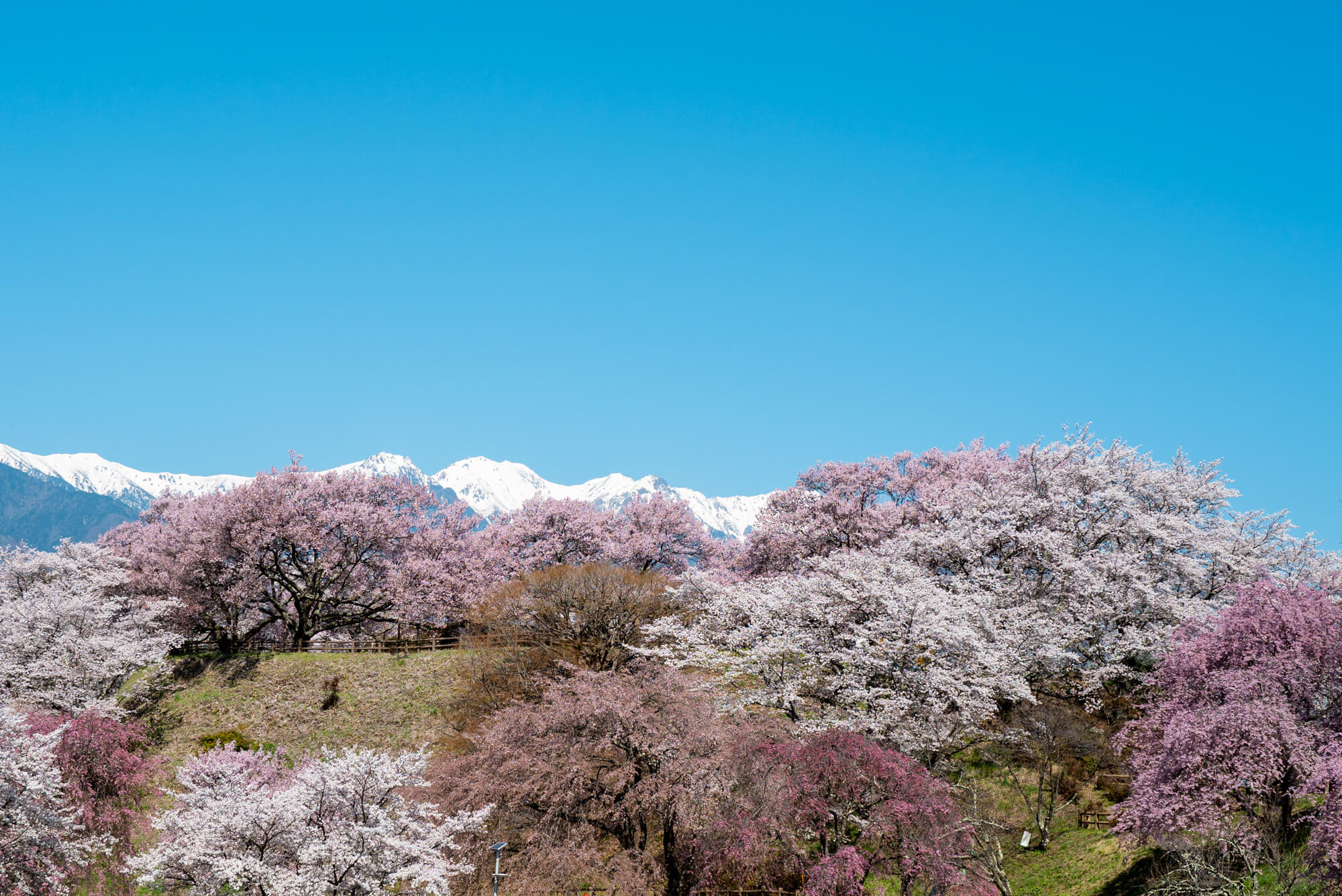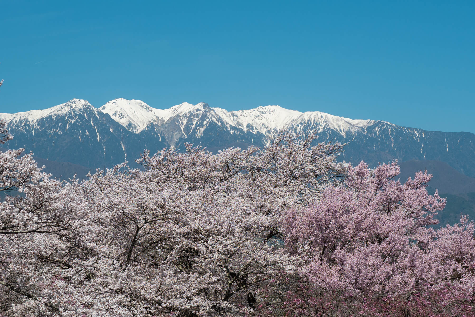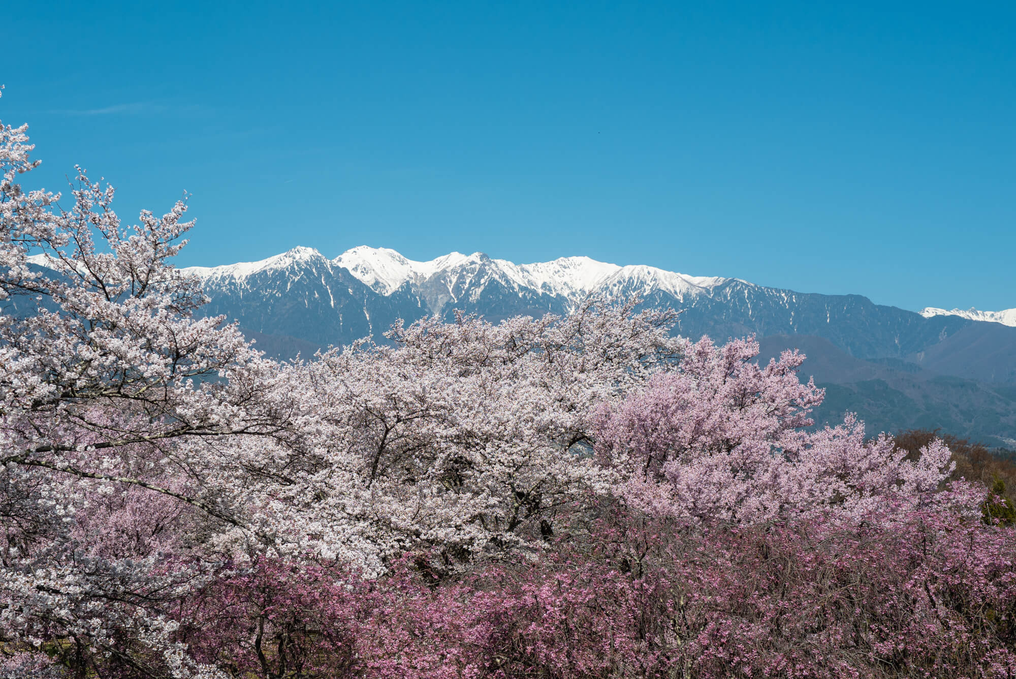 青空に映える残雪の中央アルプスを背に、多種多様な桜が斜面をピンク色に染め上げる景色は、まさに圧巻です。