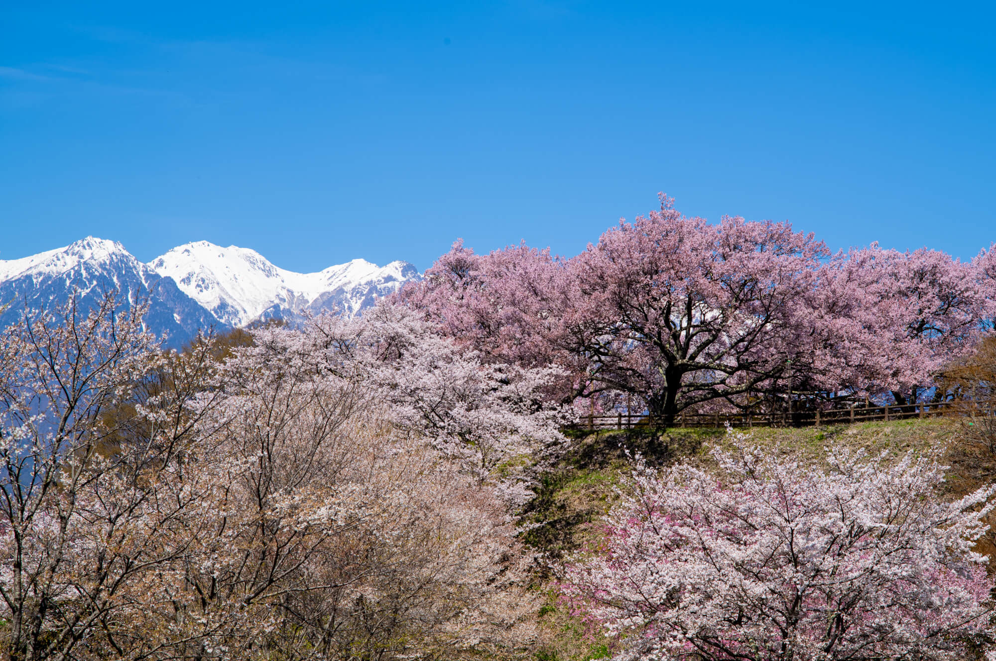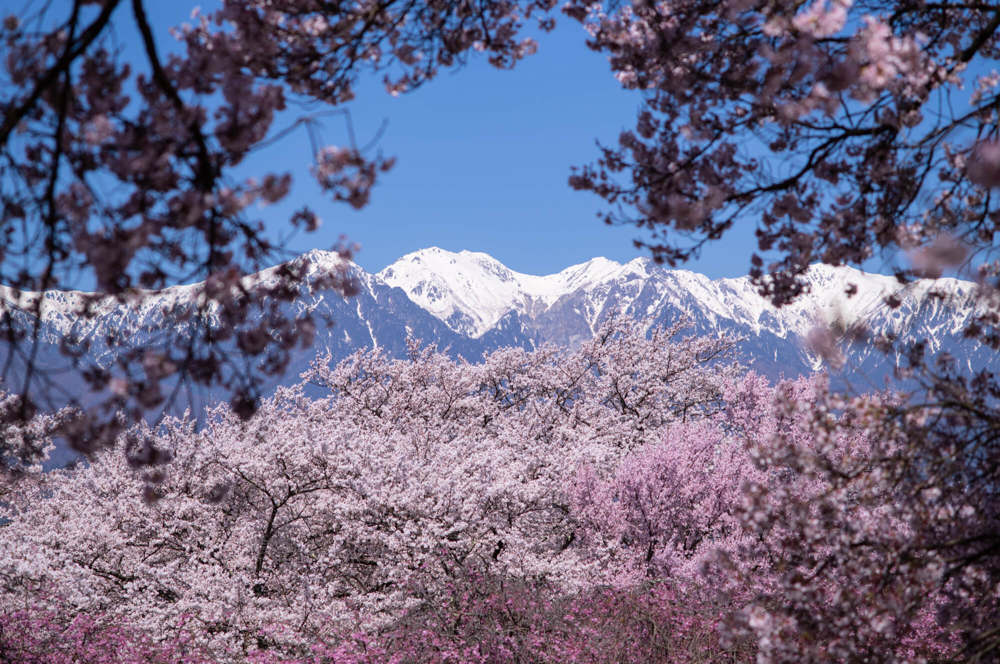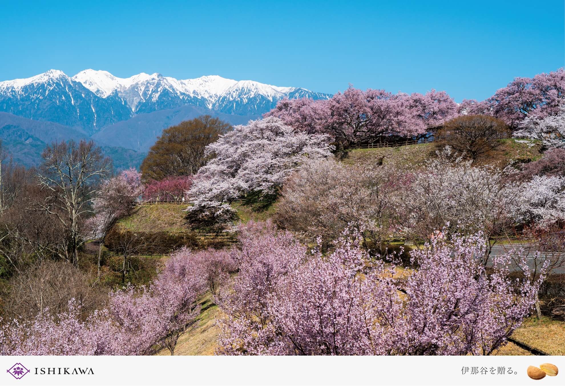 青空に映える残雪の中央アルプスを背に、多種多様な桜が斜面をピンク色に染め上げる景色は、まさに圧巻です。
