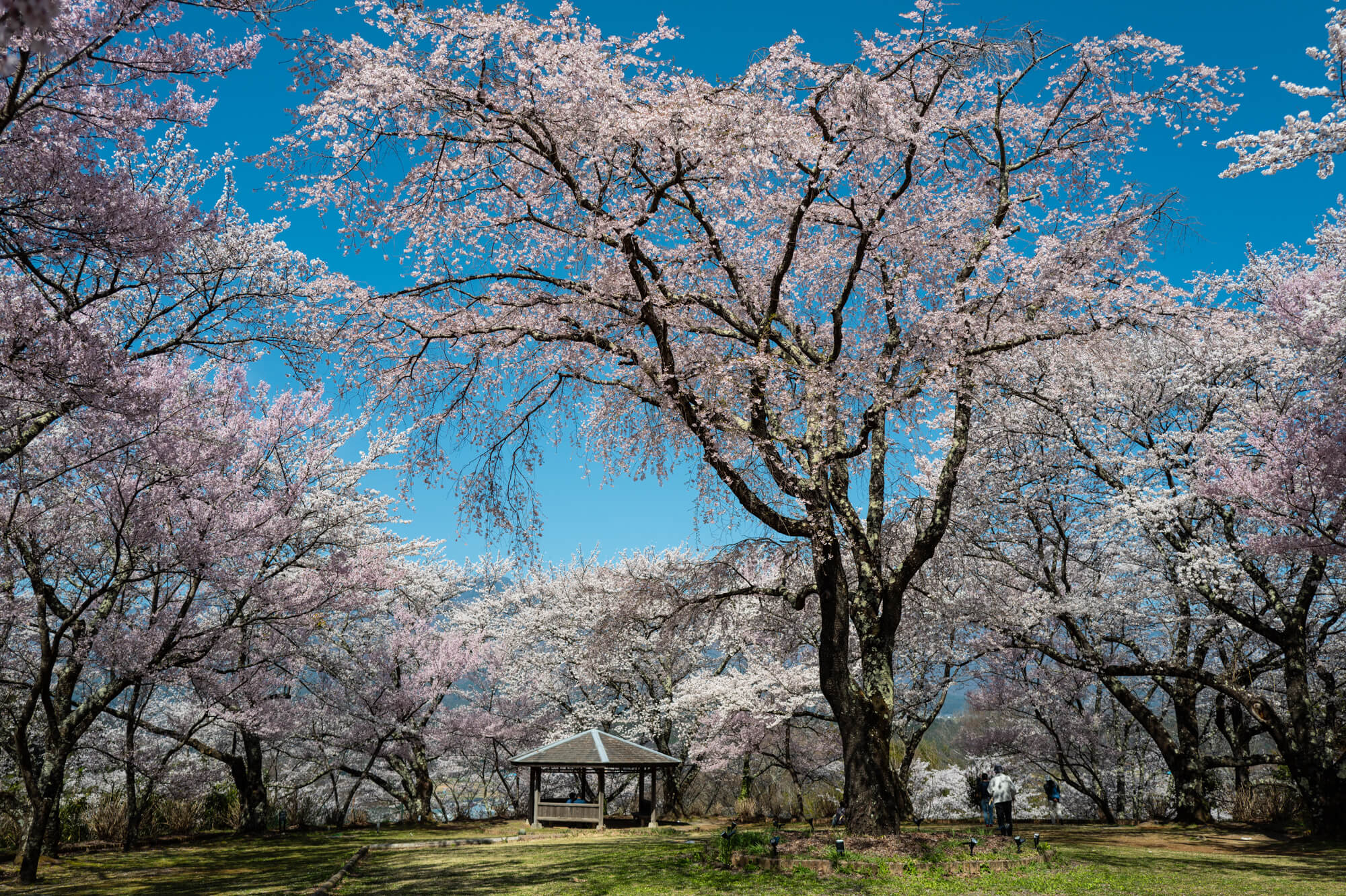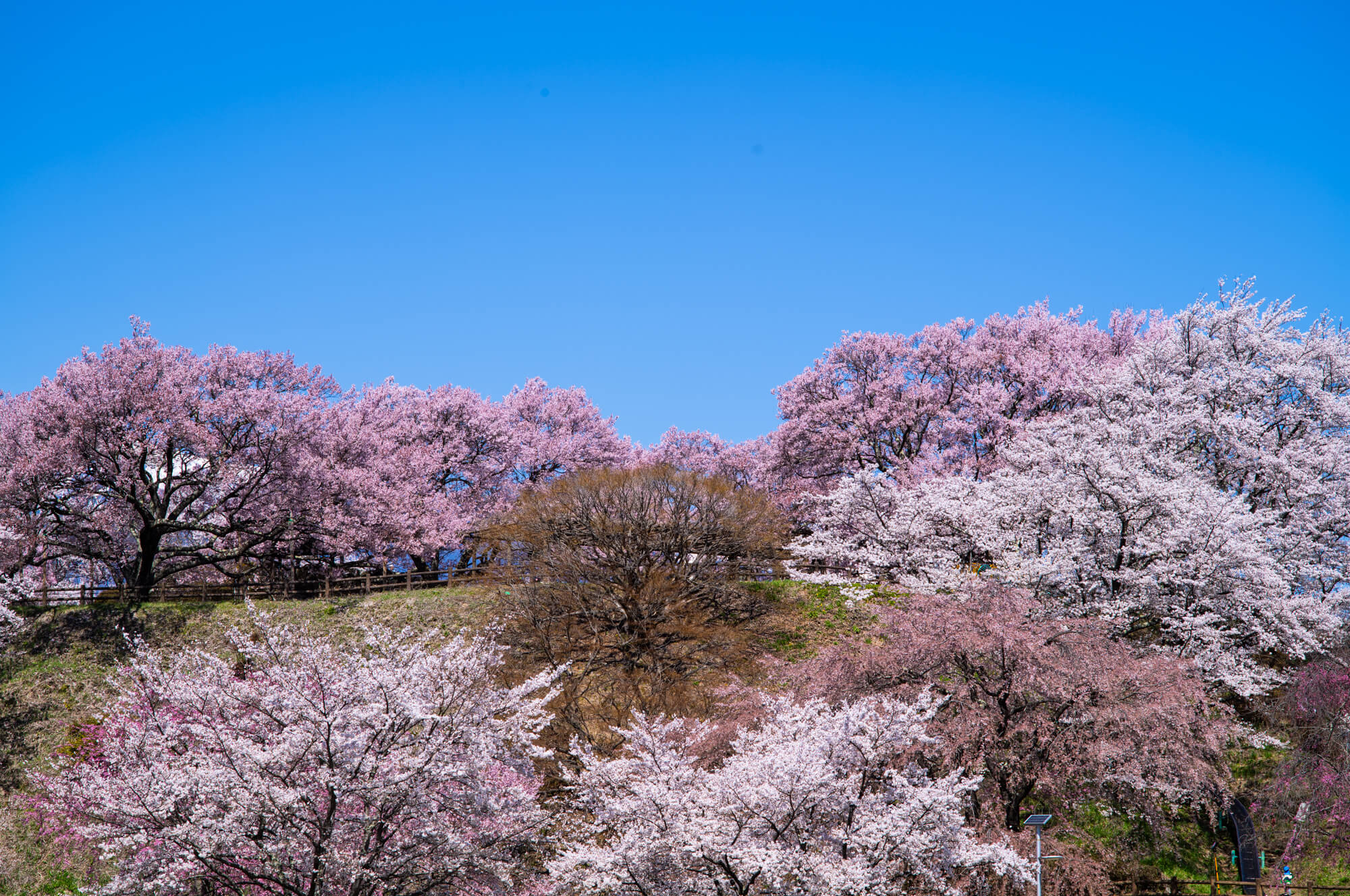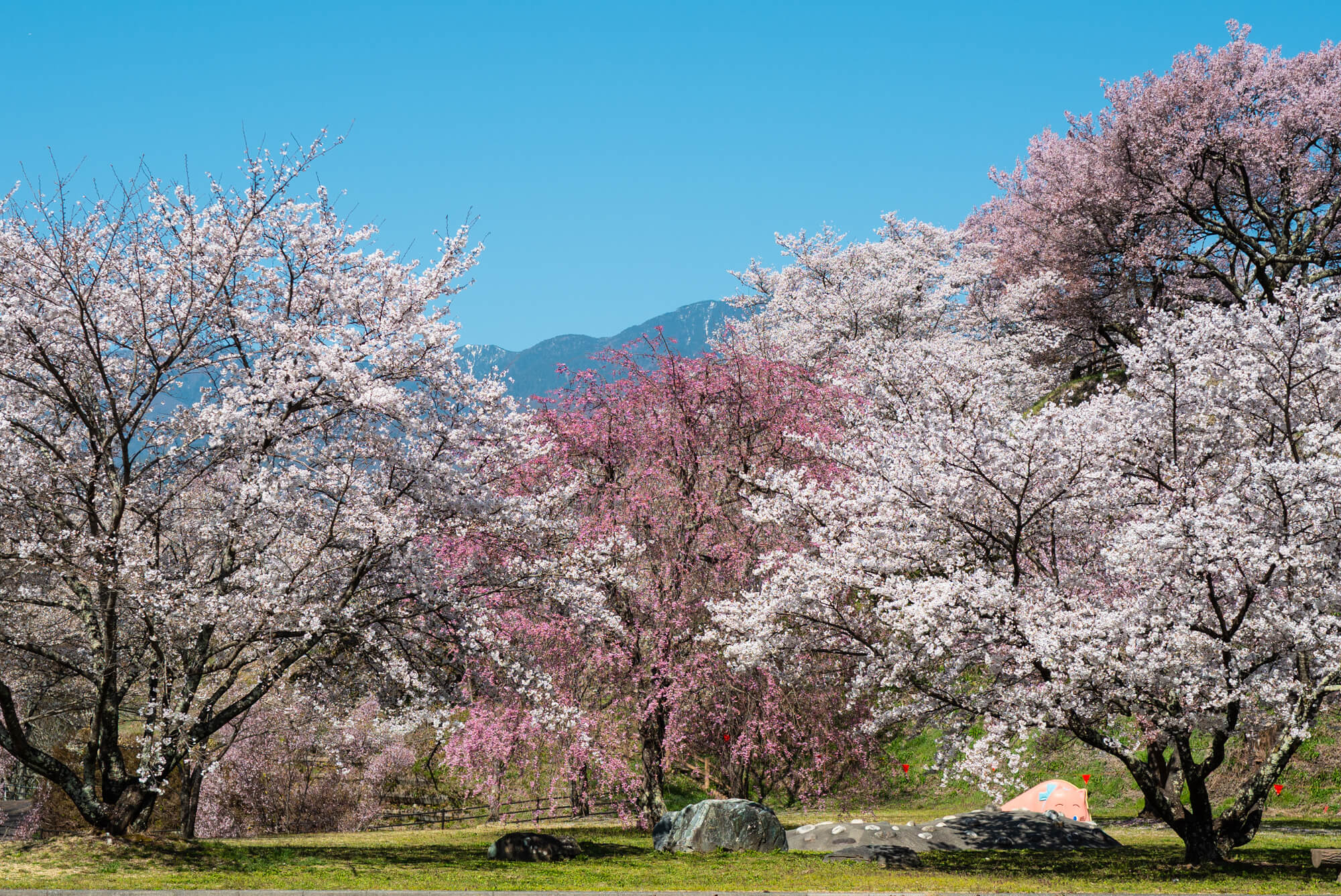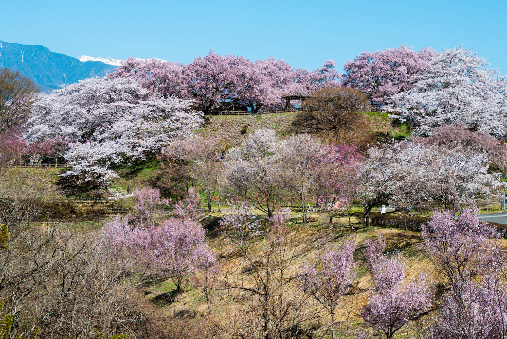 青空に映える残雪の中央アルプスを背に、多種多様な桜が斜面をピンク色に染め上げる景色は、まさに圧巻です。